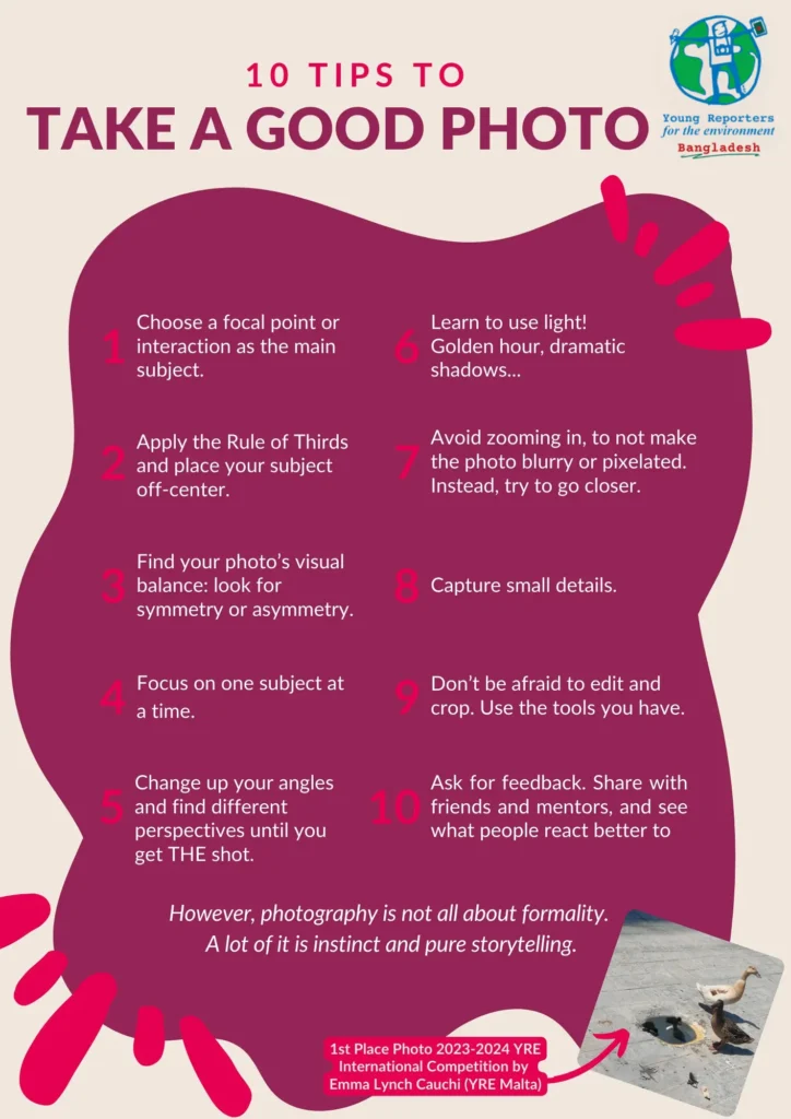 - The description and caption should explain the environmental link and/or solutions to the issue presented in the photograph.